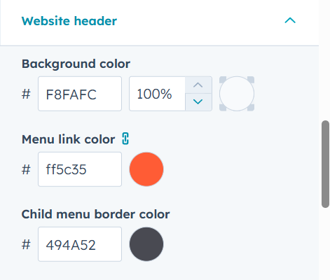 In the Website Header Settings, You can choose the Background color of the Header, Text Color, Menu link color and It’s hover state color, Menu link dropdown icon color, Child menu Background Color, Child menu link color, Child Menu Item Link hover state color and it’s Background color on hover state.